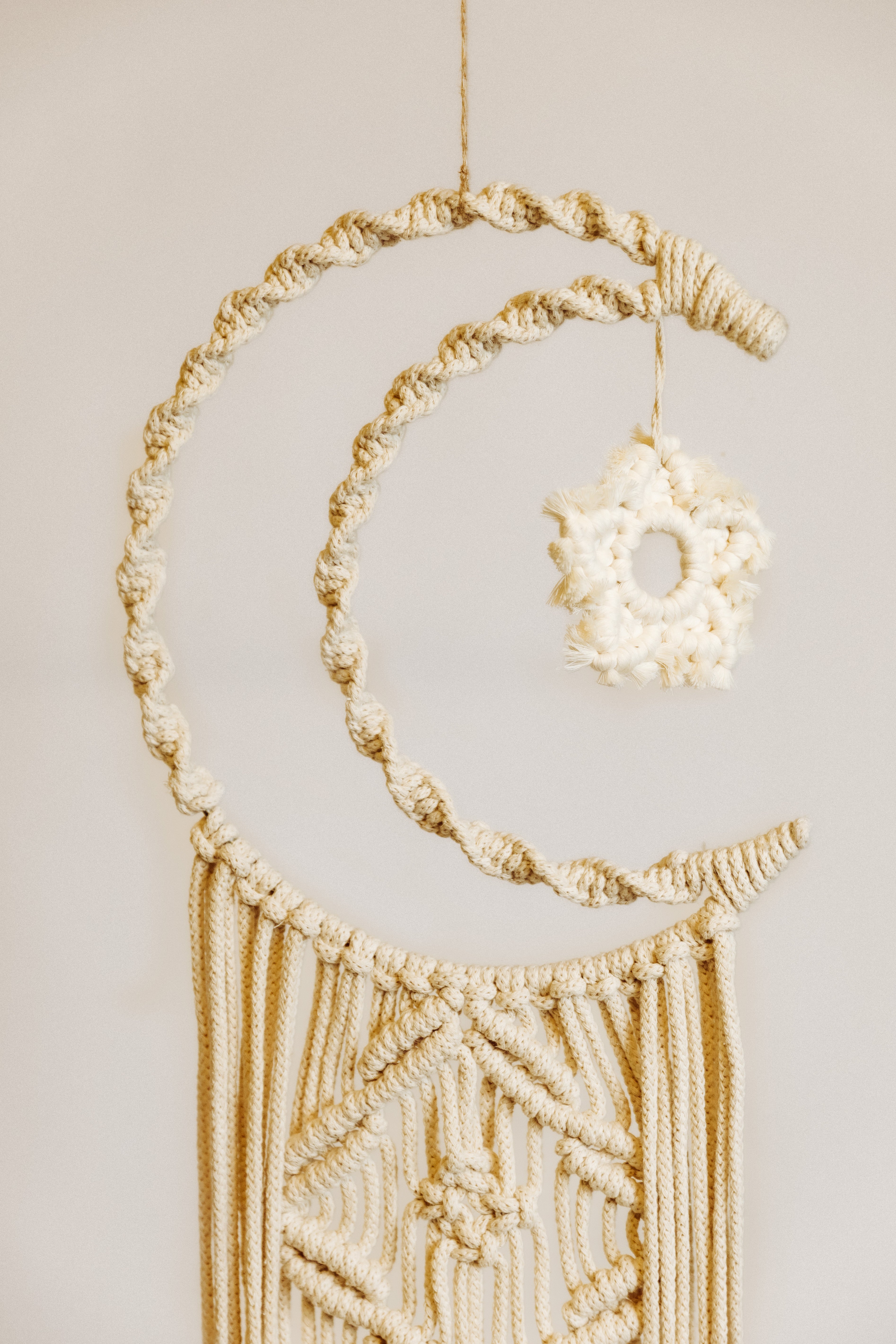 Inspired by the crescent moon of Ramadan, this macramé ornament is handwoven to create a soft yet striking decorative piece. Its elongated form allows it to hang gracefully on walls, doors, or windows, adding a calm and spiritual touch to Ramadan décor.