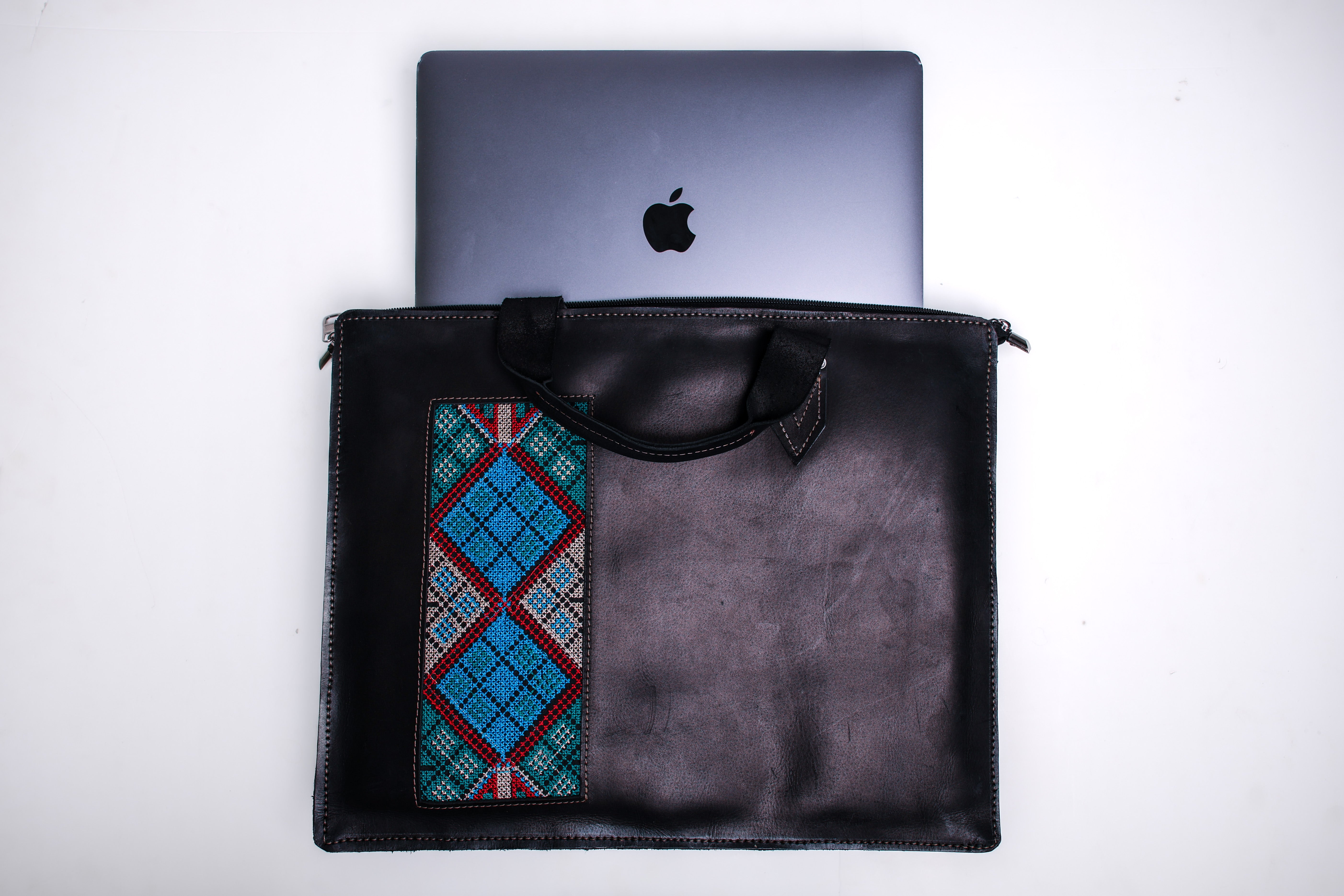 This laptop bag is made from premium genuine cowhide leather in a dark gray color. It features an internal pocket specifically designed to hold and protect a laptop, with a protective liner made of rubber and sponge, covered with waterproof material. A hollow turquoise etamine strip, 6 cm in length, is stitched on the right side of the bag. The bag includes two handles: a small one for hand carrying and a long detachable handle for shoulder carrying.